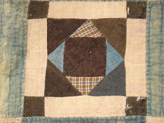 Home woven fabrics of wools and wool/cotton or wool/linen mixes are hard to date. A plaid in brown and indigo would look the same in 1770 or 1870. Blue jeans cloth like the triangles in the block above----you can imagine how hard a swatch would be to date.