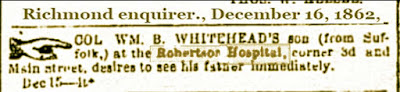 In 1864 Sally advertised in the Richmond Dispatch for information about missing "servant boy Peter who has been employed for some time past as butler at Robertson Hospital." He might have run away or "been impressed by the Government officials," which might have been a common fate. It's hard to see how old he was but he was only 4 feet tall.