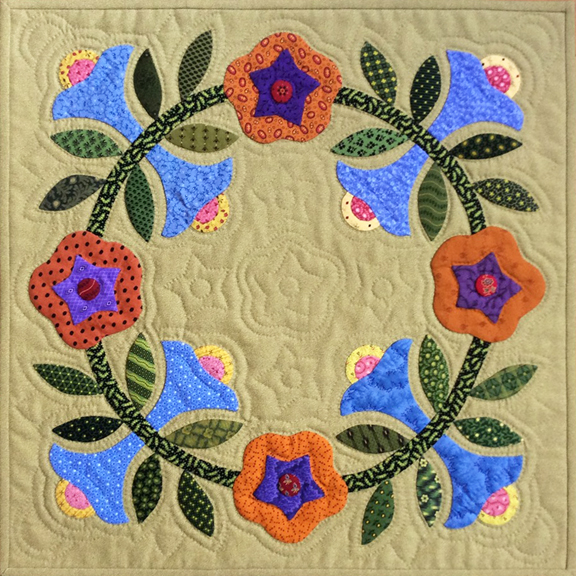 We can't see much of the patchwork side but the pattern looks to be a variation of Birds in the Air,