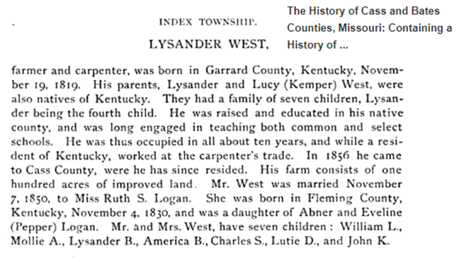 Eldest son Lysander II joined many other Kentuckians in moving to Missouri before the Civil War settling in Cass County in the western part of the state near Kansas City. Others of her children and siblings also seemed to have lived and died in Missouri.